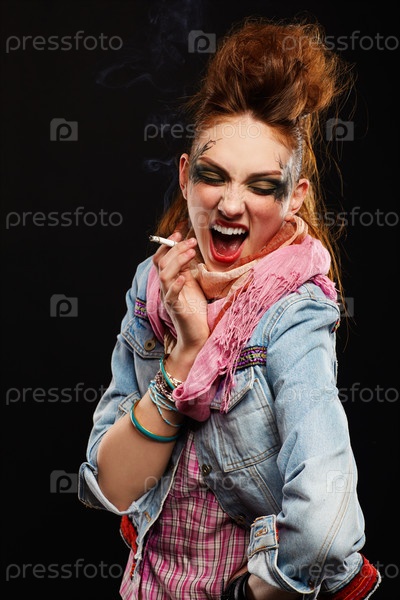 Рыжеволосая девушка-панк с сигаретой на черном фоне