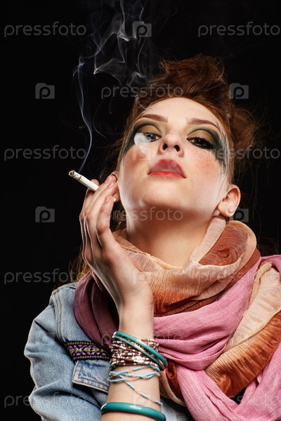 Рыжеволосая девушка-панк с сигаретой на черном фоне