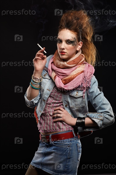 Рыжеволосая девушка-панк с сигаретой на черном фоне
