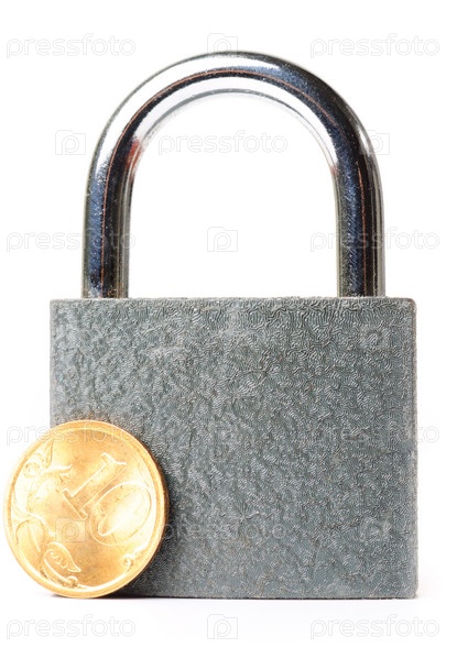 Замок и монета на белом фоне