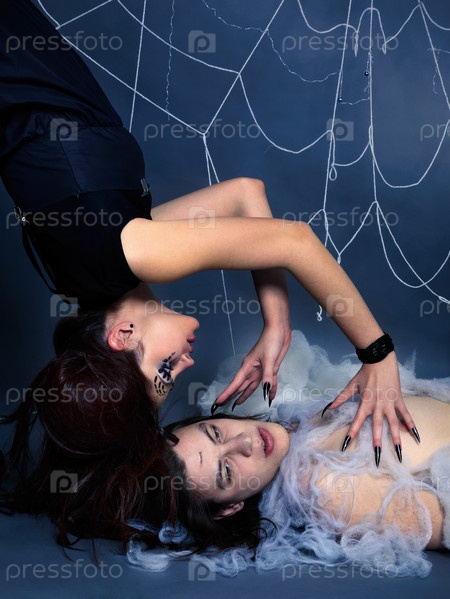 Девушка с нарисованным на лице пауком висит вниз головой над парнем в коконе