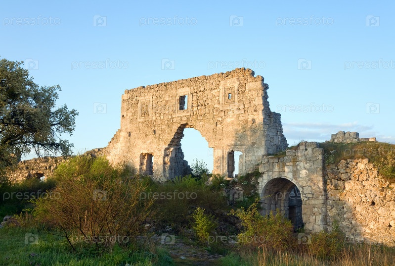 Каменистые развалины крепости Мангуп Кале на фоне облачного неба