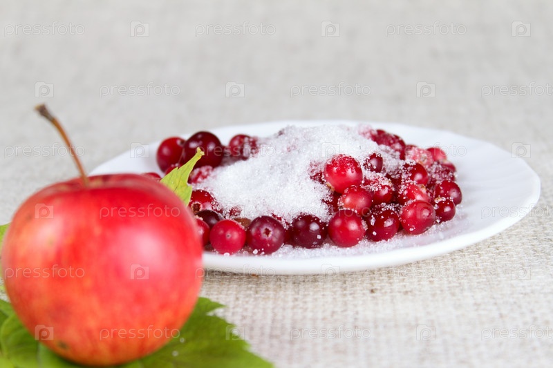Тарелка ковберри, посыпанная сахаром и удаленной вблизи от льняного салфетки