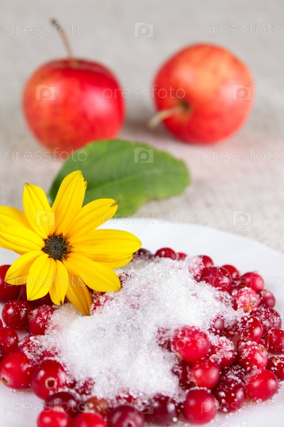 Тарелка ковберри, посыпанная сахаром и удаленной вблизи от льняного салфетки