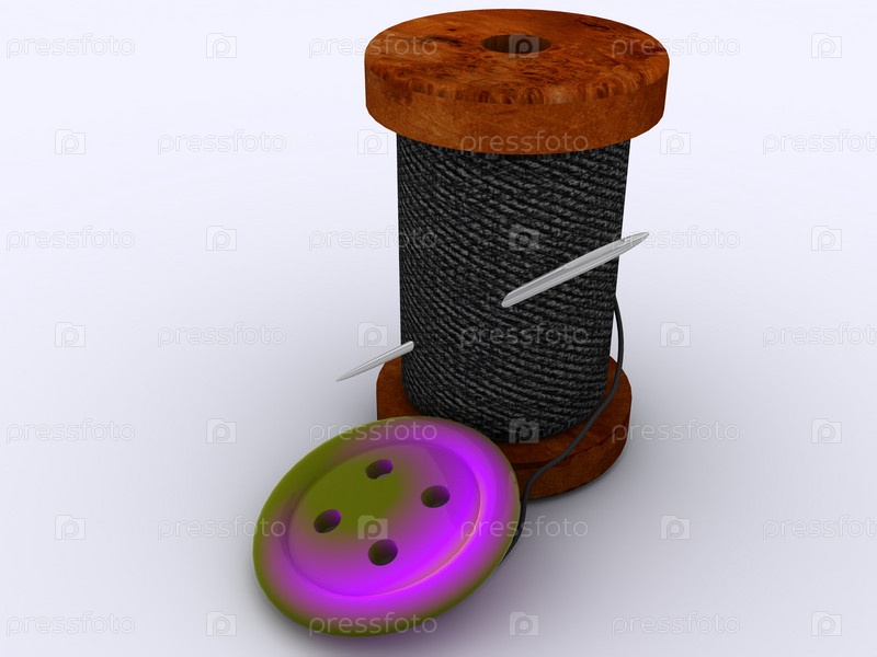 Катушка нитей, игла и кнопка. 3D