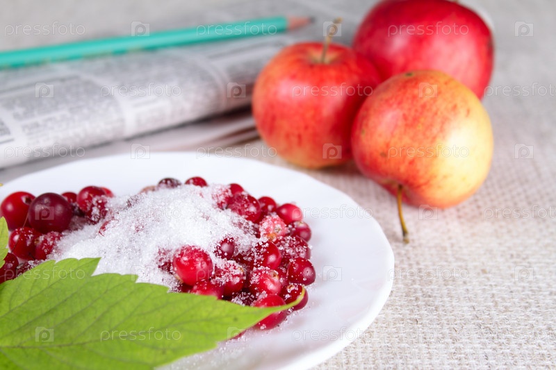 Тарелка ковберри, посыпанная сахаром и удаленной вблизи от льняного салфетки
