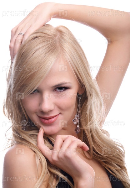 Портрет улыбающейся блондинки на белом фоне
