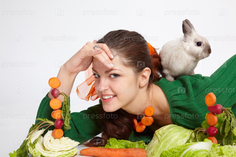 Девушка лежит на полу с кроликом и овощами