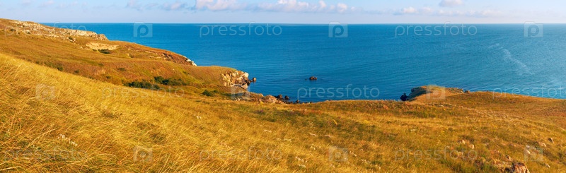Морской пляж с небольшой скалистой лагуной и прибрежной травой