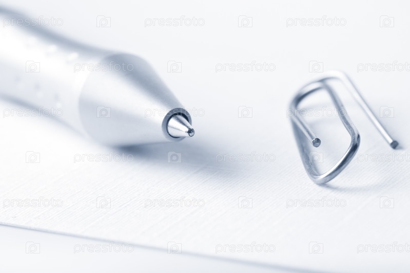 Авторучка и скрепка, крупный план