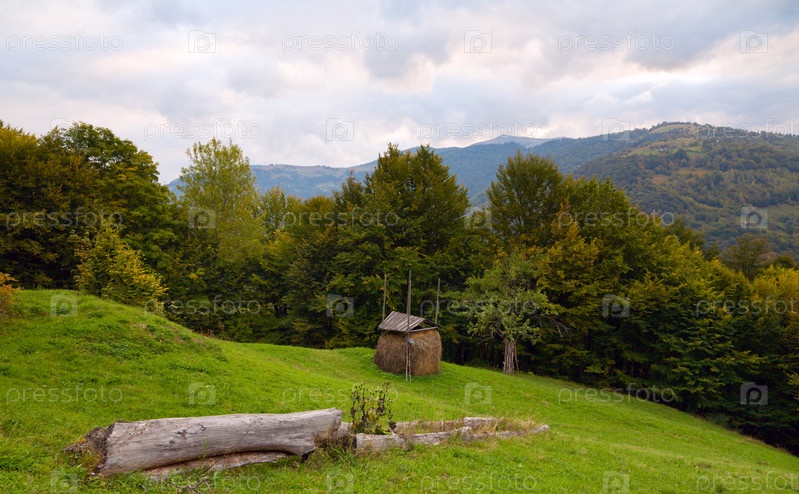 Бревно и стог сена на лесной поляне в Карпатских горах