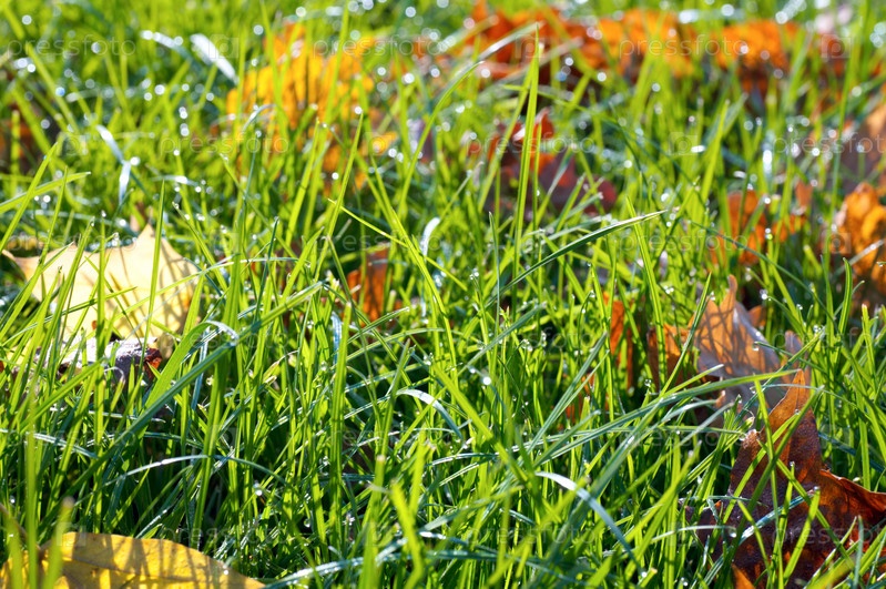 Осенняя листва в мокрой зеленой траве