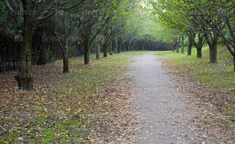 Пешеходная дорога в парке усыпана осенней листвой