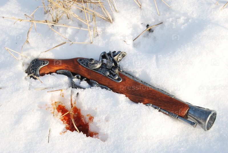 Макет старинного пистолета в снегу с каплями крови