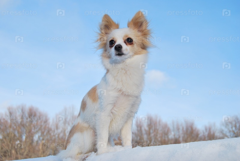 Маленькая собачка в снегу на фоне леса и голубого неба