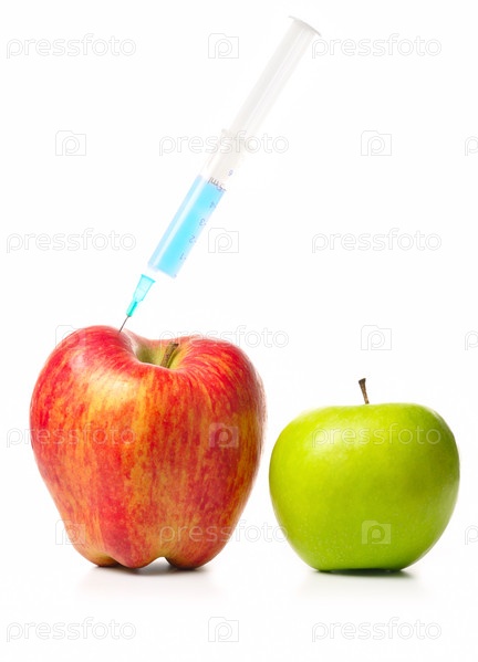 Метафора генно-модифицированных фруктов. Маленькое яблоко и большое яблоко со шприцем