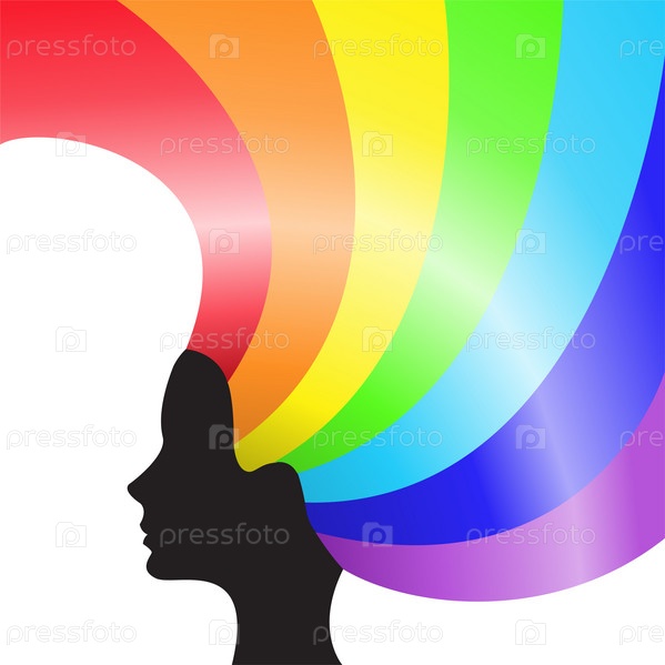 Черный силуэт женской головы с радужными волосами