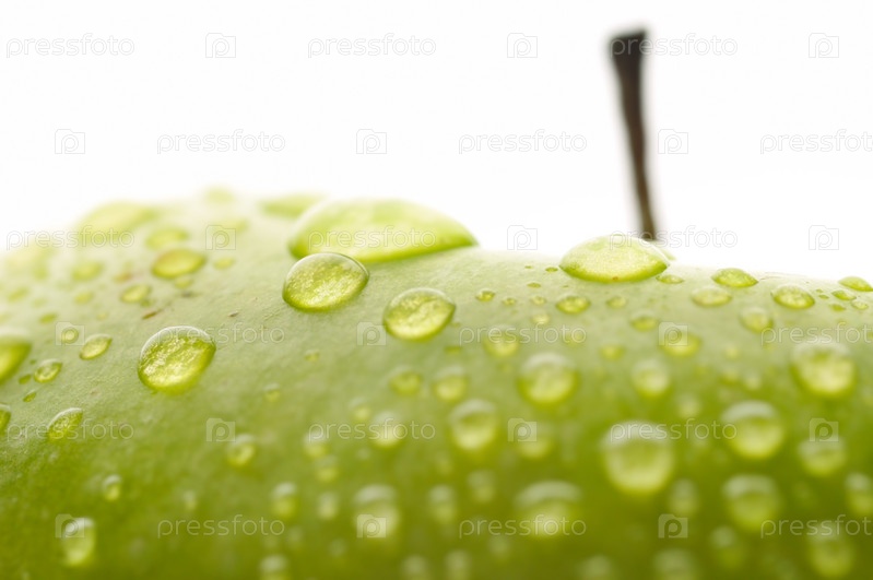 Мокрое зеленое яблоко крупным планом на белом фоне