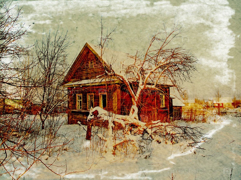 Иллюстрация деревенского дома в зимнюю пору