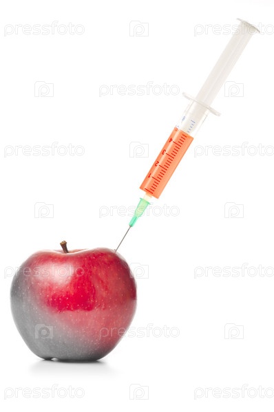 Метафора генно-модифицированных фруктов. Яблоко со торчащим шприцом