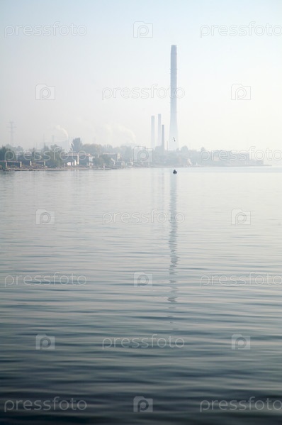 Заводская башня на фоне туманного неба отражается в Азовском море