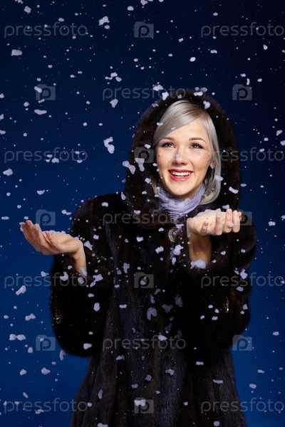 Портрет улыбающейся блондинки в шубе на синем фоне