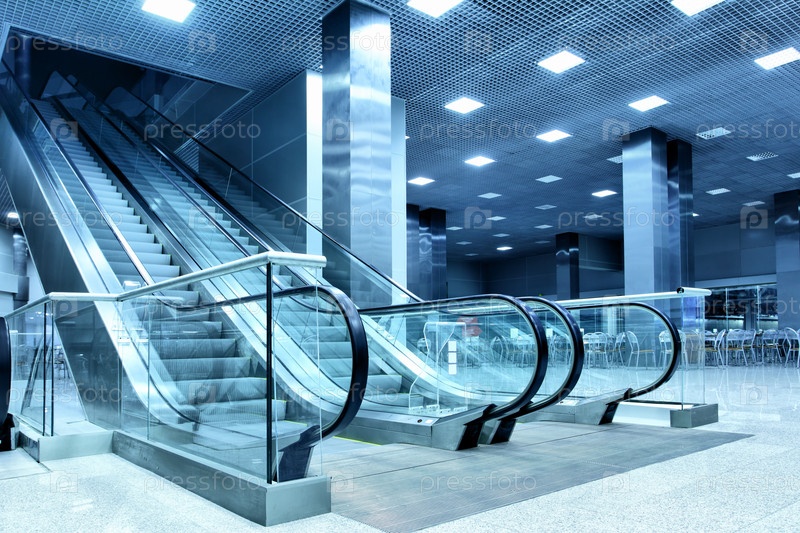 Просторный зал с эскалатором, синий цвет