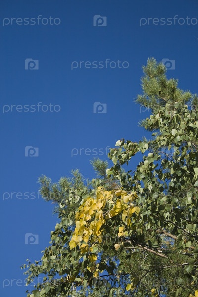 Фрагмент ветки дерева на фоне синего неба. зелено-желтые листья