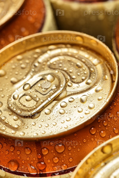Золотистая пивная банка с каплями воды