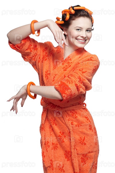 Девушка в оранжевом халате и бигудях на белом фоне
