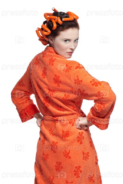 Девушка в оранжевом халате и бигудях на белом фоне
