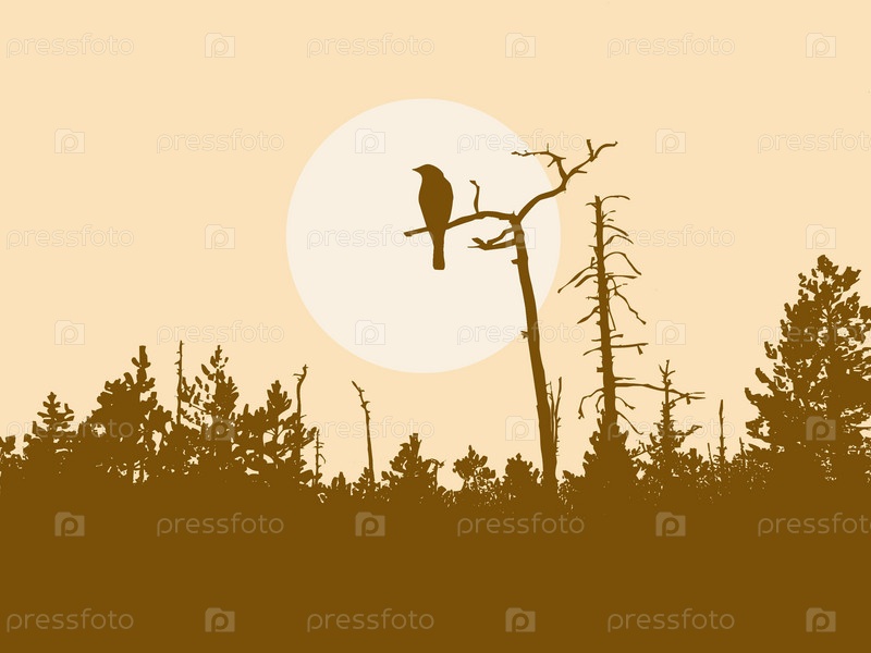 Птица на ветке старого дерева на фоне луны