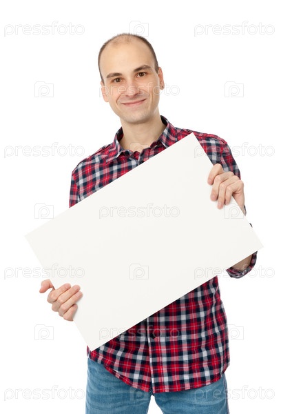 Мужчина с чистой белой карточкой на белом фоне