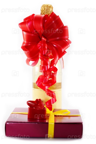 Бутылка шампанского, подарок и коробочка в виде сердца на белом фоне