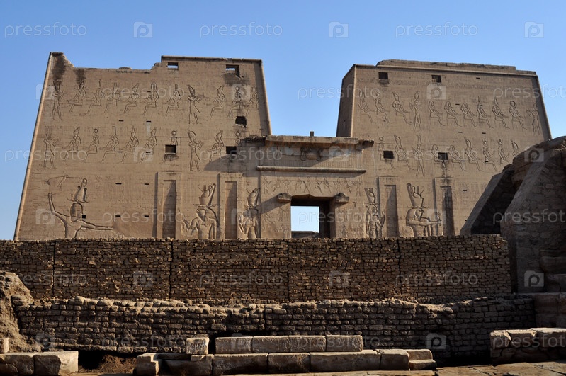 Фрагмент стены египетского храма с иероглифами и фресками