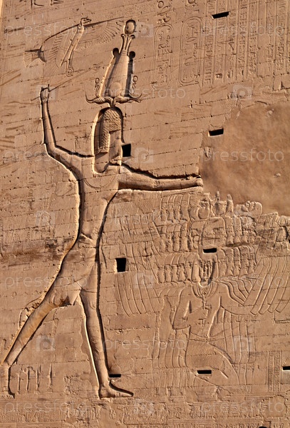 Фрагмент стены египетского храма с иероглифами и фресками