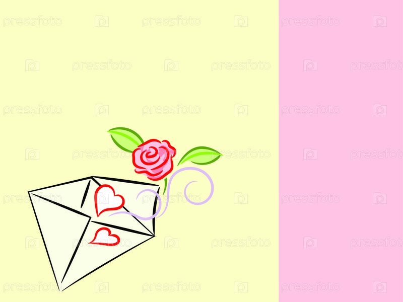 Открытый почтовый конверт с сердцами и розой на желтом фоне