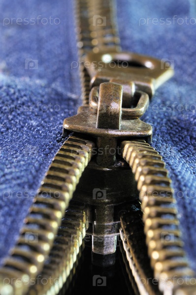 Металлическая застежка-молния крупным планом на зеркальной поверхности