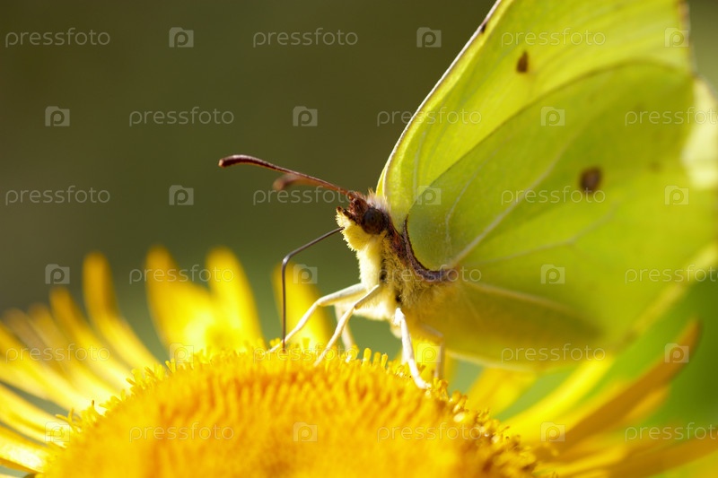 Бабочка-лимонница на желтом цветке крупным планом