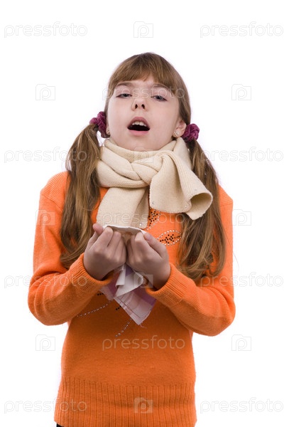 Маленькая девочка на белом фоне в зимней одежде больна