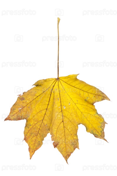 Кленовый желтый лист на белом фоне