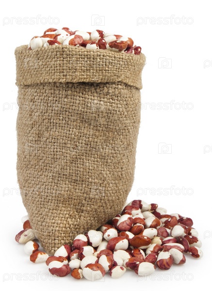 Мешок полный цветной фасоли на белом фоне