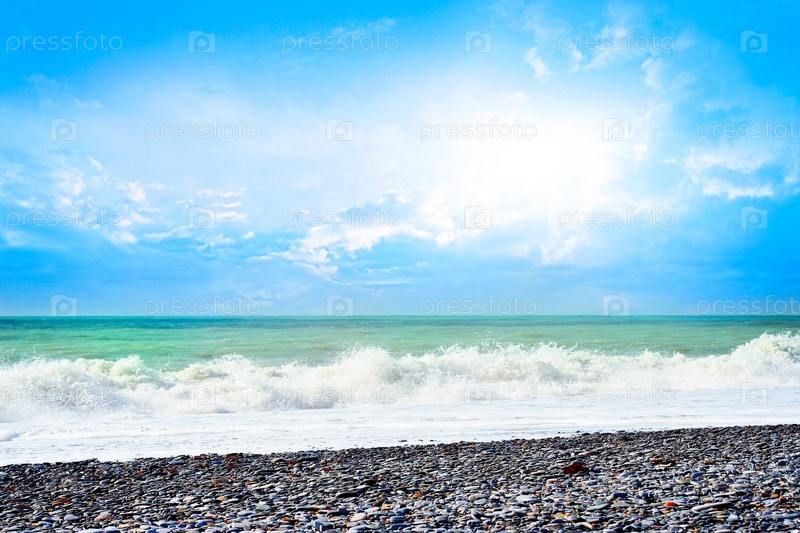 Морское побережье на фоне голубого неба