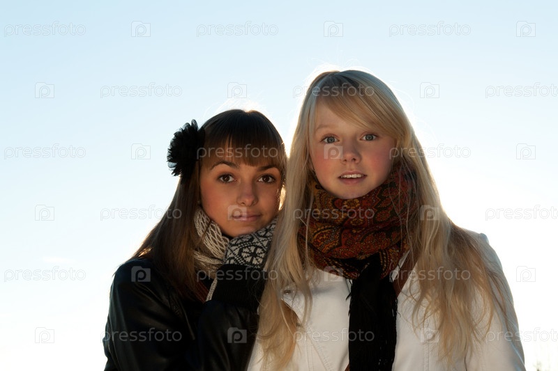 Две девушки в куртках и шарфах стоят на улице весной