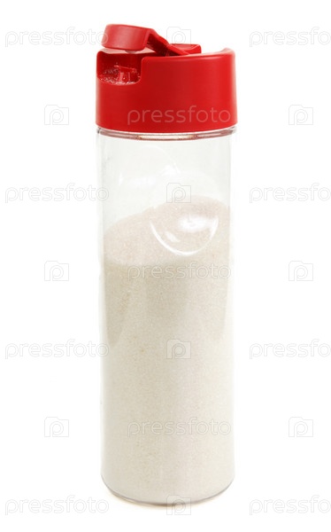 Прозрачная вазочка с сахаром на белом фоне