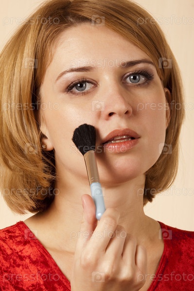 Красивая блондинка наносит макияж большой кистью