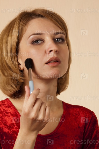 Красивая блондинка наносит макияж большой кистью