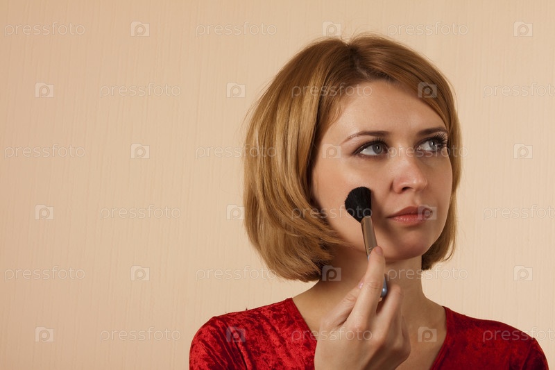 Красивая блондинка наносит макияж большой кистью