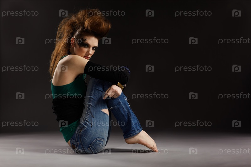 Портрет рыжей девушки-панка на сером фоне