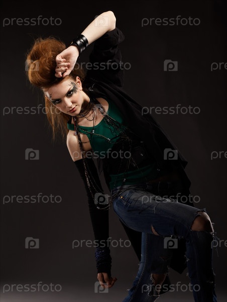 Портрет рыжей девушки-панка на сером фоне